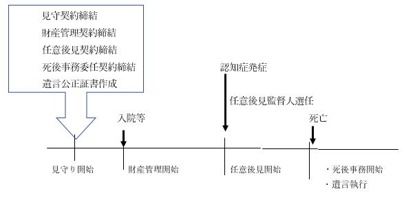 - 元気なうちに財産管理契約や任意後見契約、死後事務契約を締結したとしても、自分の状態が変化したことを契約相手が認識しなければ各種契約をした意味がありません。そこで、例えば毎月上旬には電話連絡をとる、電話に応答しないようになれば自宅へ伺う、3か月に1回は面会するなどを内容とした契約をしておくことで、状況の変化を相手に知ってもらうことができ、その状態に沿った財産保護・身上監護が期待できます。